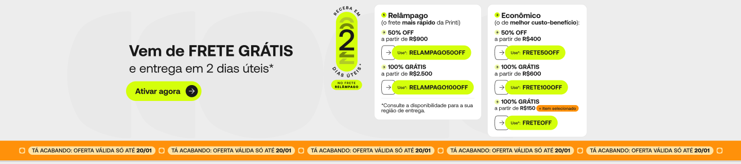 Ganhe 25% OFF no seu primeiro pedido, em compras acima de R$200. Basta aplicar o cupom VEMPRAPRINTI no campo “Cupom de Desconto”.