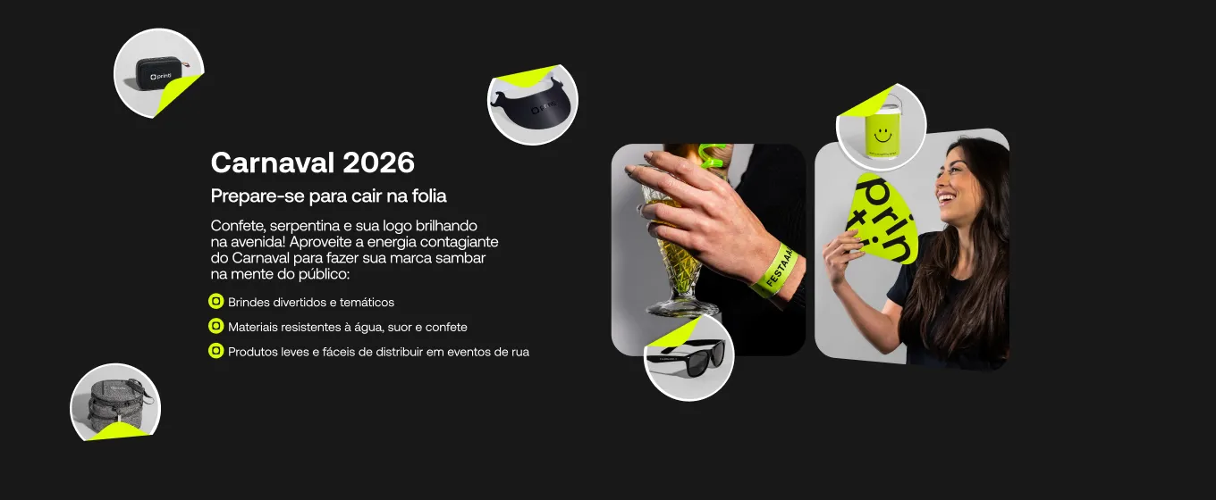 Materiais personalizados para o Carnaval! Viseiras, leques, brindes e acessórios para blocos, festas e eventos. Impressão de qualidade para sua folia.