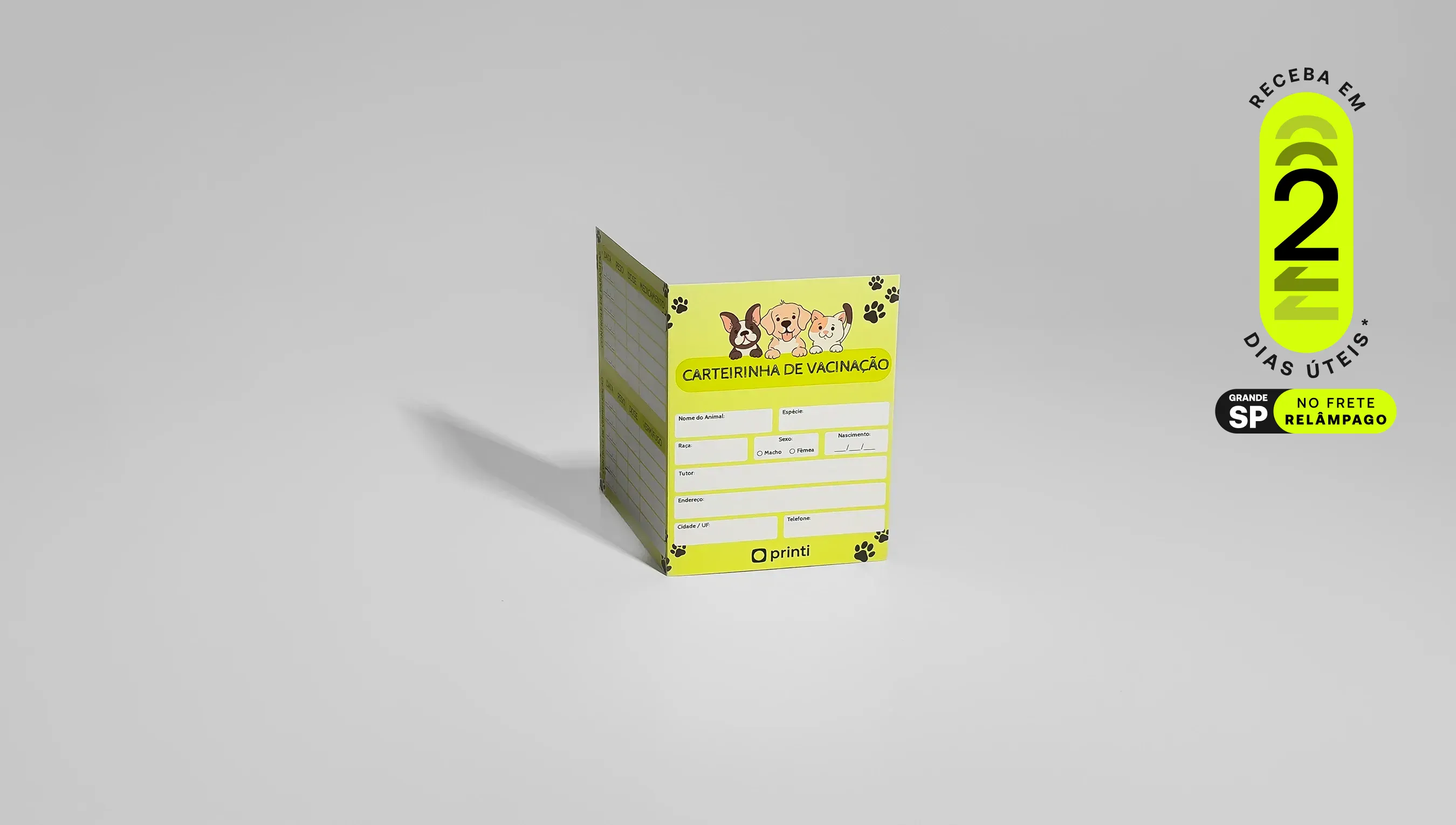 Na Printi, você pode escolher o tipo de papel, o acabamento ideal e personalizar cada detalhe da carteira de vacinação para pet de acordo com a identidade visual da sua marca ou projeto.
