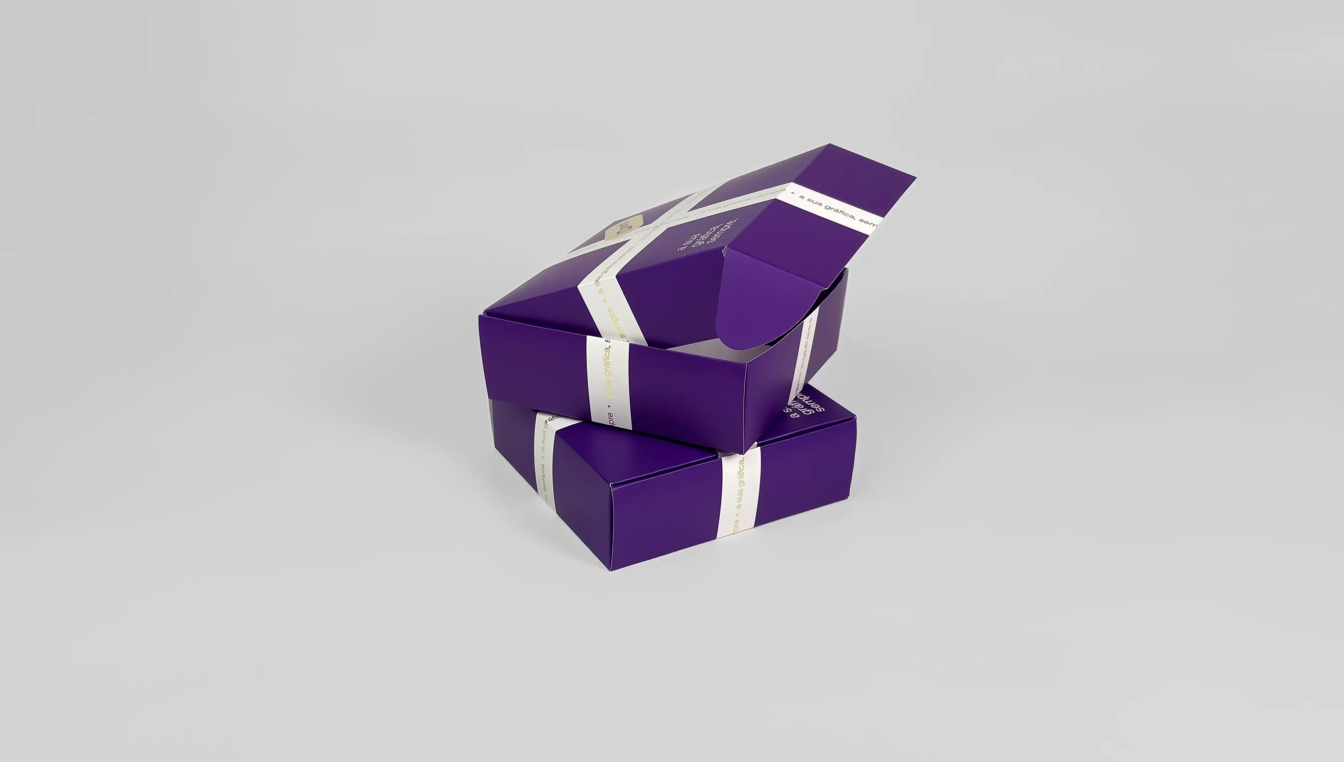 Embalagens basculantes com detalhe em hot stamping, perfeitas para produtos sofisticados.