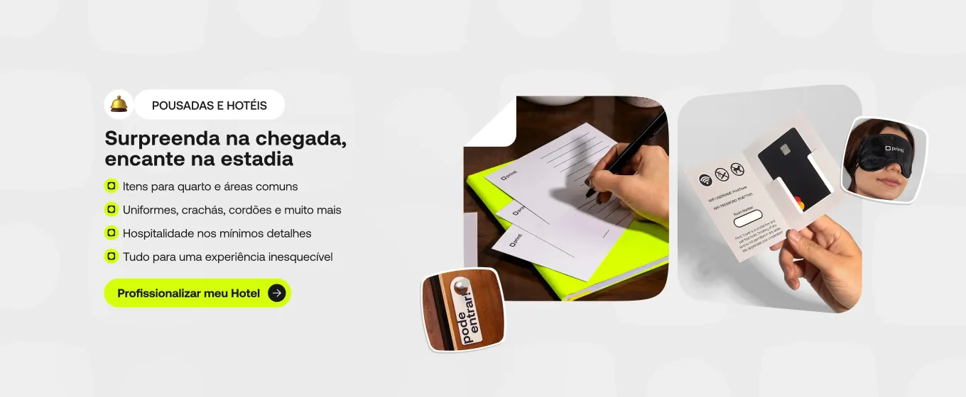 Da recepção ao quarto, sua marca presente em todos os pontos de contato: papelaria, uniformes, sinalização e muito mais.