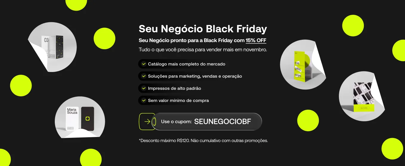 Produtos personalizados para o seu negócio com 15% OFF de desconto para você aproveitar ainda mais a Black Friday aqui na Printi. Desconto por tempo limitado.